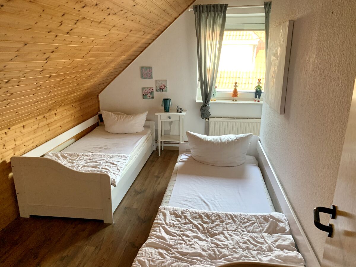 Im Erdgeschoss befindet sich der Wohn- und Essbereich mit TV und DVD-Player, die gut ausgestattete Küchenzeile und das Badezimmer mit Dusche. Die beiden Schlafzimmer, eines mit Doppelbett und eines mit zwei Einzelbetten, sowie ein Kinderreisebett und ein Gäste-WC mit Waschmaschine befinden sich im Dachgeschoss. Alle Schlafräume sind mit Außenjalousien ausgestattet. . Ein PKW-Stellplatz ist direkt am Haus.