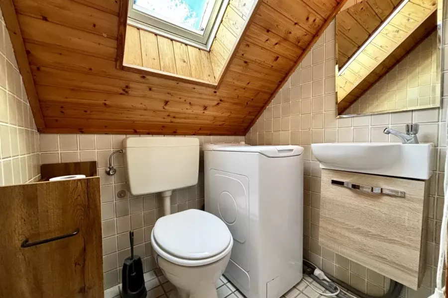 Im Erdgeschoss befindet sich der Wohn- und Essbereich mit TV und DVD-Player, die gut ausgestattete Küchenzeile und das Badezimmer mit Dusche. Die beiden Schlafzimmer, eines mit Doppelbett und eines mit zwei Einzelbetten, sowie ein Kinderreisebett und ein Gäste-WC mit Waschmaschine befinden sich im Dachgeschoss. Alle Schlafräume sind mit Außenjalousien ausgestattet. . Ein PKW-Stellplatz ist direkt am Haus.