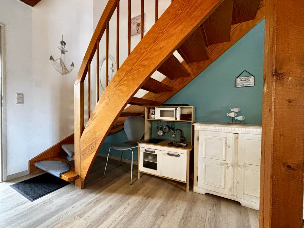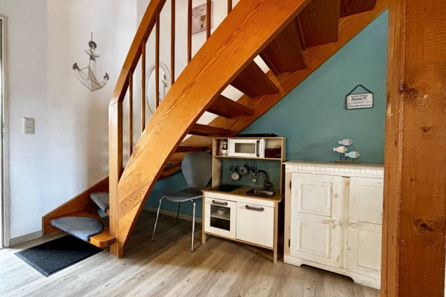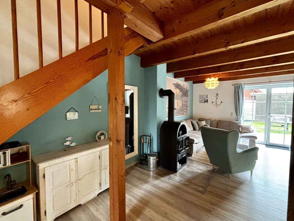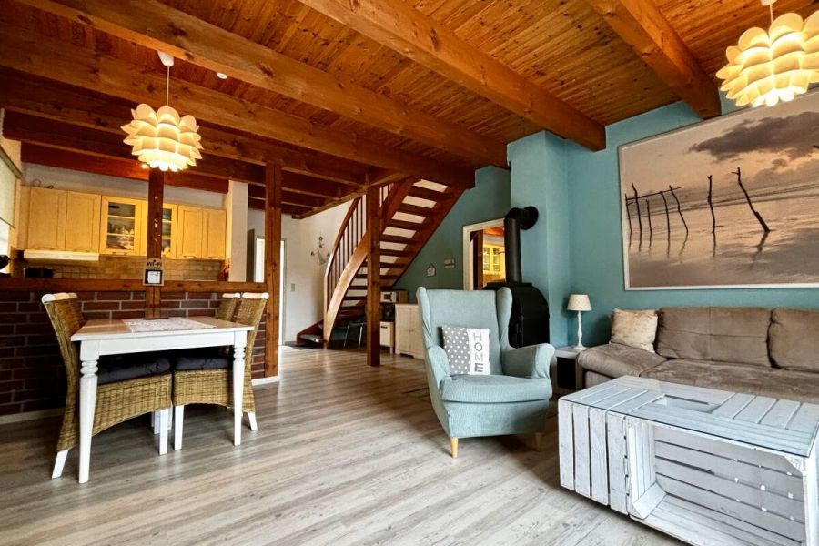 Das Ferienhaus „Friesenstorch“ ist eine toll eingerichtete Doppelhaushälfte mit einer Wohnfläche von ca. 65m². Im Erdgeschoss befinden sich der Wohn- und Essbereich mit offener Küche und direktem Zugang auf die Terrasse, und das Badezimmer mit Waschmaschine. Der Kaminofen im Wohnbereich sorgt in den kalten Wintermonaten für eine reichlich Wohlfühlatmosphäre. Über eine Holztreppe gelangen Sie in das Dachgeschoss des tollen Ferienhauses. Hier steht Ihnen ein Schlafraum mit einem Doppelbett und weiteres Schlafzimmer mit Einzelbett und einem Tandembett (für 2 Personen) zur Verfügung. Für kleinere Kinder haben wir einen Kinderhochstuhl, einen Wickeltisch und ein festes Kinderbett. Das Ferienhaus hat einen eingezäunten Garten mit Terrasse, nebst Gartenmöbeln.