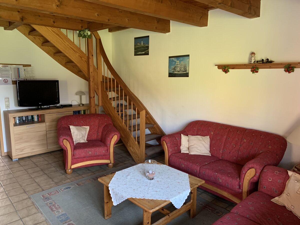 Im unteren Bereich befindet sich der Wohn-und Essbereich mit anliegender gut ausgestatteter Küchenzeile. Weiter Im Erdgeschoss befindet sich ein Badezimmer mit Dusche und Waschmaschine sowie ein Schlafzimmer mit einem Hochbett. Zwei weitere Schlafräume, eines mit Doppelbett und eines mit zwei Einzelbetten, sowie ein Kinderreisebett und ein Gäste-WC sind in der 1.Etage. Highlight ist die Hauseigene Sauna.